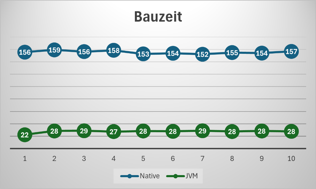 Now we come to the big disadvantage of native builds: the build time. Due to the way Mandrel works, the source code is compiled twice: first to JVM bytecode, which is then compiled to native bytecode in the second step. This extends the build time to several minutes even for our simple examples. Fortunately, this step only has to be carried out once per deployment, which is manageable in most situations.