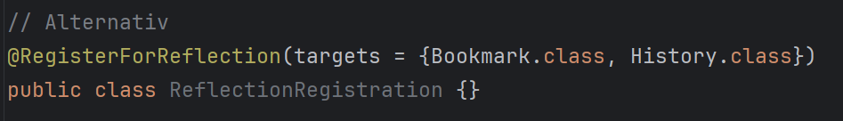 In contrast to the JVM, a general reflection is no longer possible with the native build, as Mandrel removes unused code paths. Unfortunately, reflection is used extensively, e.g. for serialization and ORMs such as Hibernate. Fortunately, Quarkus offers a way to register classes for reflection, the appropriately named annotation @RegisterForReflection . This can either be applied to the corresponding classes or using the targets parameter, which is particularly helpful for classes from external artifacts: