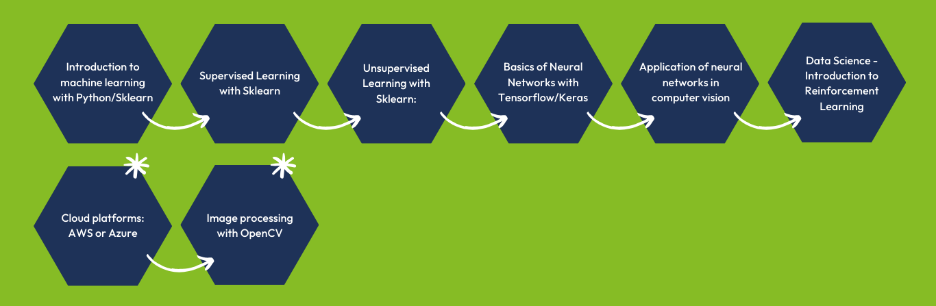 Start your journey to becoming a Machine Learning Engineer with our specialized learning path. You will start with an introduction to machine learning with Python and Sklearn, learn about the most important methods and how they are applied in real business scenarios. Deepen your knowledge of supervised and unsupervised learning and explore the world of neural networks with Tensorflow and Keras, especially as applied to computer vision. Discover how machines can learn in a similar way to humans through our Reinforcement Learning course. Also, choose between cloud platforms such as AWS or Azure and expand your skills in image processing with OpenCV. This learning path is your key to becoming an experienced machine learning engineer.